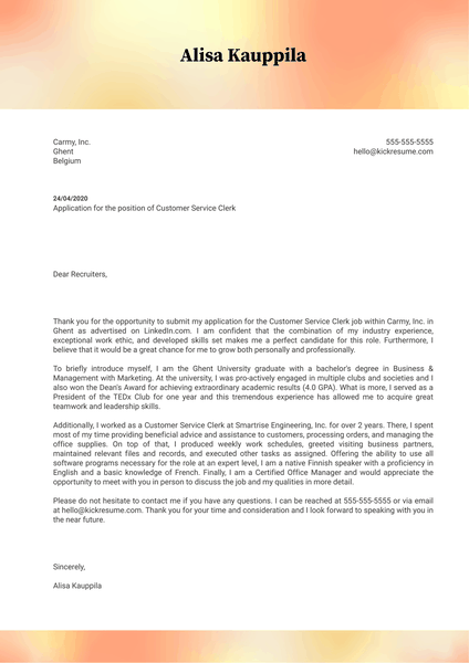 Esempio di lettera di presentazione per Servizio Clienti - Cvapp.it Usa questo modello di lettera di presentazione per Servizio Clienti per ultimare la tua candidatura ed essere assunto velocemente - di' addio a dubbi e incertezze. Questo esempio di lettera di presentazione è stato studiato appositamente per la professione di Servizio Clienti nel mercato del 2022.