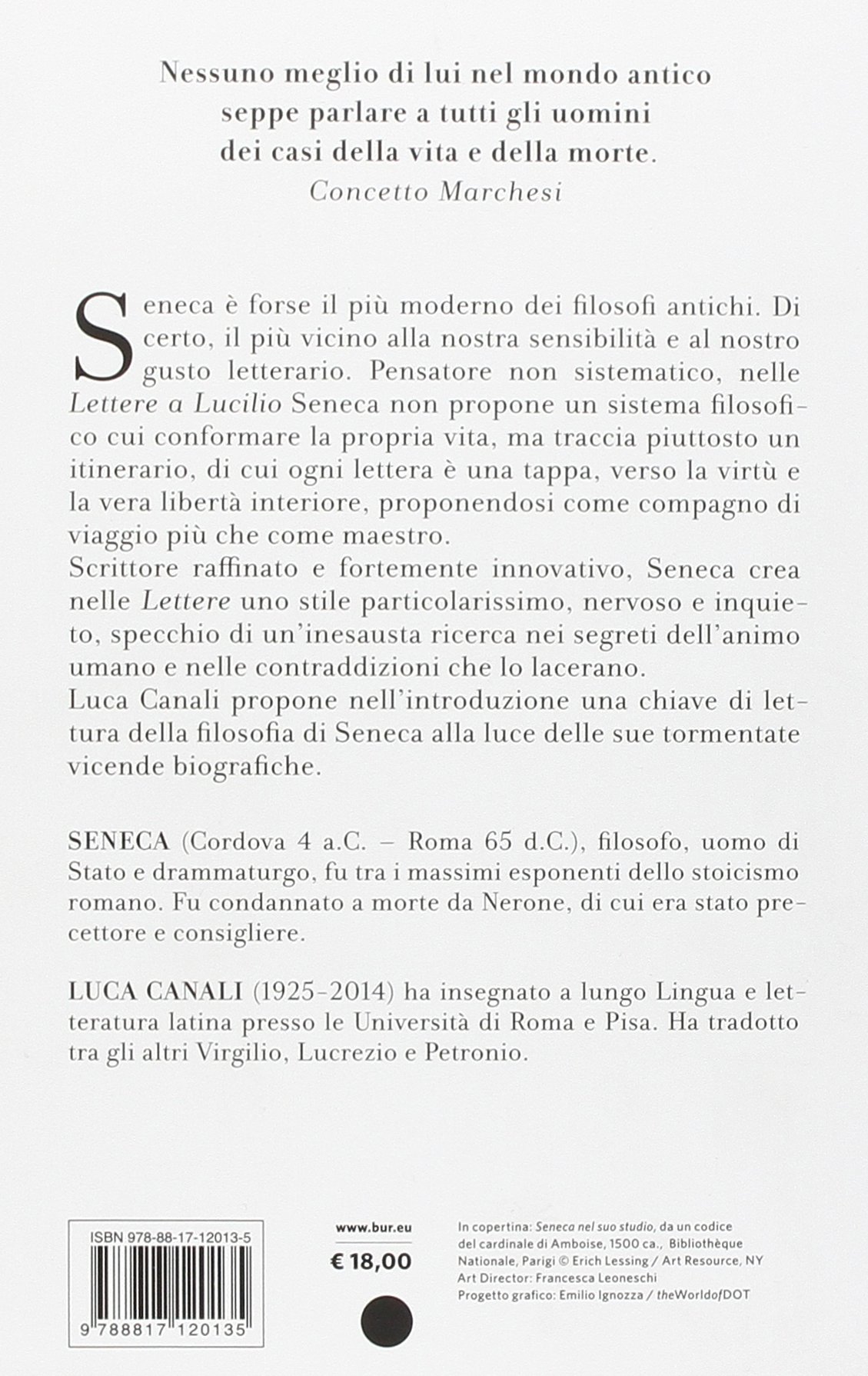 Seneca - Comportati così, Lucilio mio - Libriantichionline.com Seneca. Brani scelti: SENECA, Lettere a Lucilio - Incipit (Milano, Bompiani 2000). Comportati così, Lucilio mio: rivendica i tuoi diritti su te stesso, e il tempo che finora ti veniva portato via o ti veniva rubato o ti sfuggiva di mano, trattienilo e custodiscilo. Convinciti che le cose stanno proprio così come ti scrivo: certi momenti ci ...