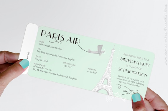 Invito alla carta d'imbarco per feste a tema di Parigi, invito al biglietto aereo reale, francese, doccia nuziale Mint Silver, Rendez vous de Paris, ...