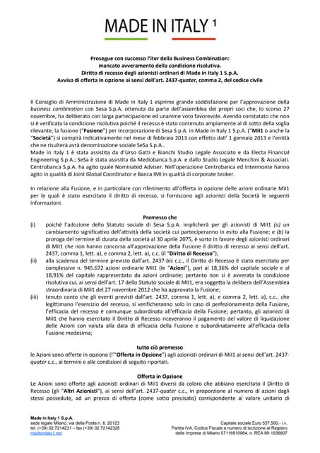 Recesso del Socio - Modello, Fac-Simile - Word e PDF Il diritto di recesso viene esercitato mediante lettera raccomandata che deve essere spedita entro quindici giorni dall'iscrizione nel registro delle imprese della delibera che lo legittima, con l'indicazione delle generalità del socio recedente, del domicilio per le comunicazioni inerenti al procedimento, del numero e della categoria delle azio...